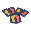 Crafted from soft denim fabric, each piece features a hook & loop backing, allowing for easy attachment to any closed-loop carpeted surface. Brightly screen-printed hands and feet enhance visibility and engagement during training sessions.