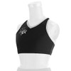 Comfortable Nastia Liukin workout sports bra in Black Nylon/Spandex features a breathable racer back in Black Mesh and Silver Mystique binding around the neckline, shoulders and back. Clear SWAROVSKI ELEMENTS highlight the open back detail.